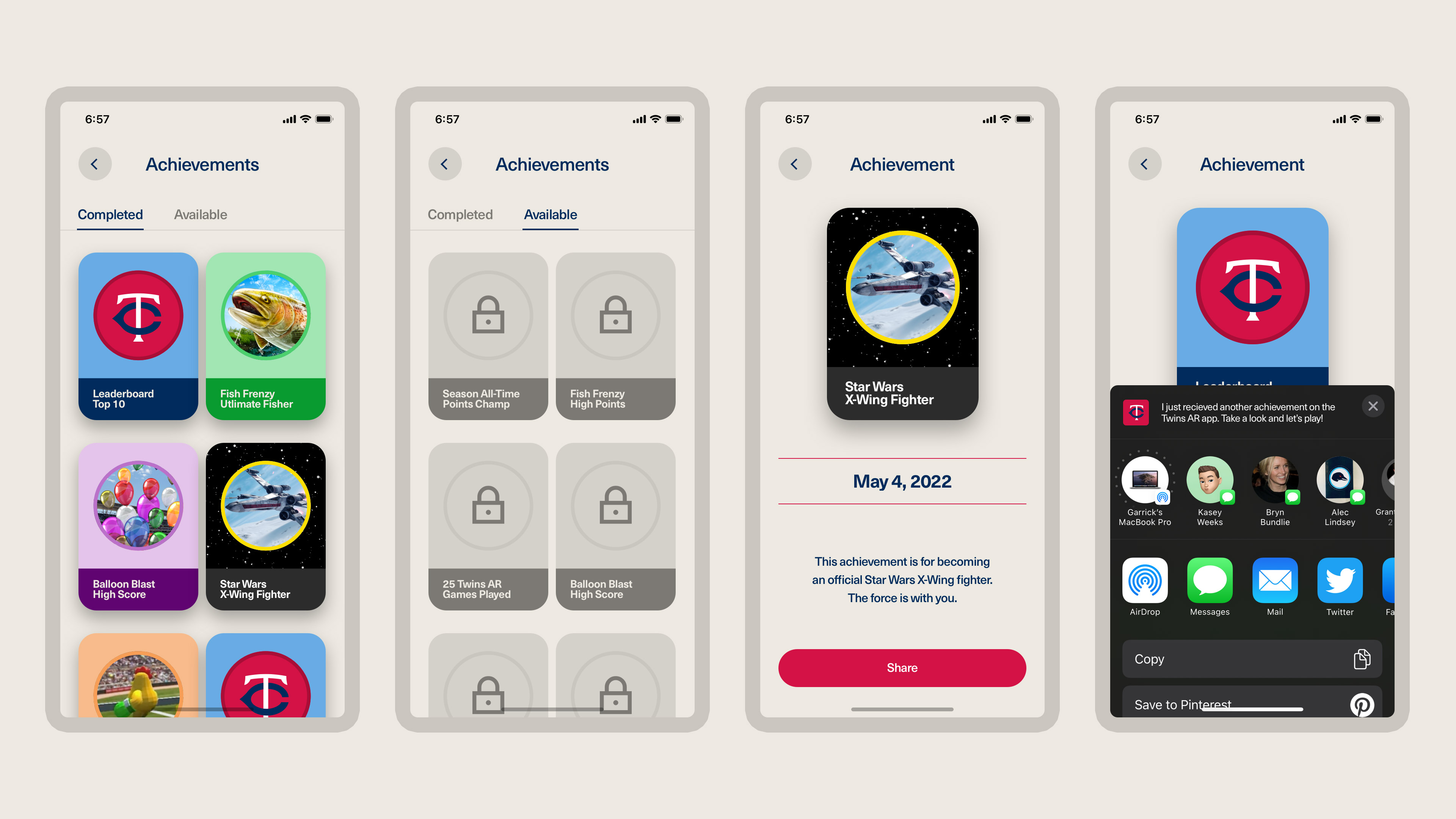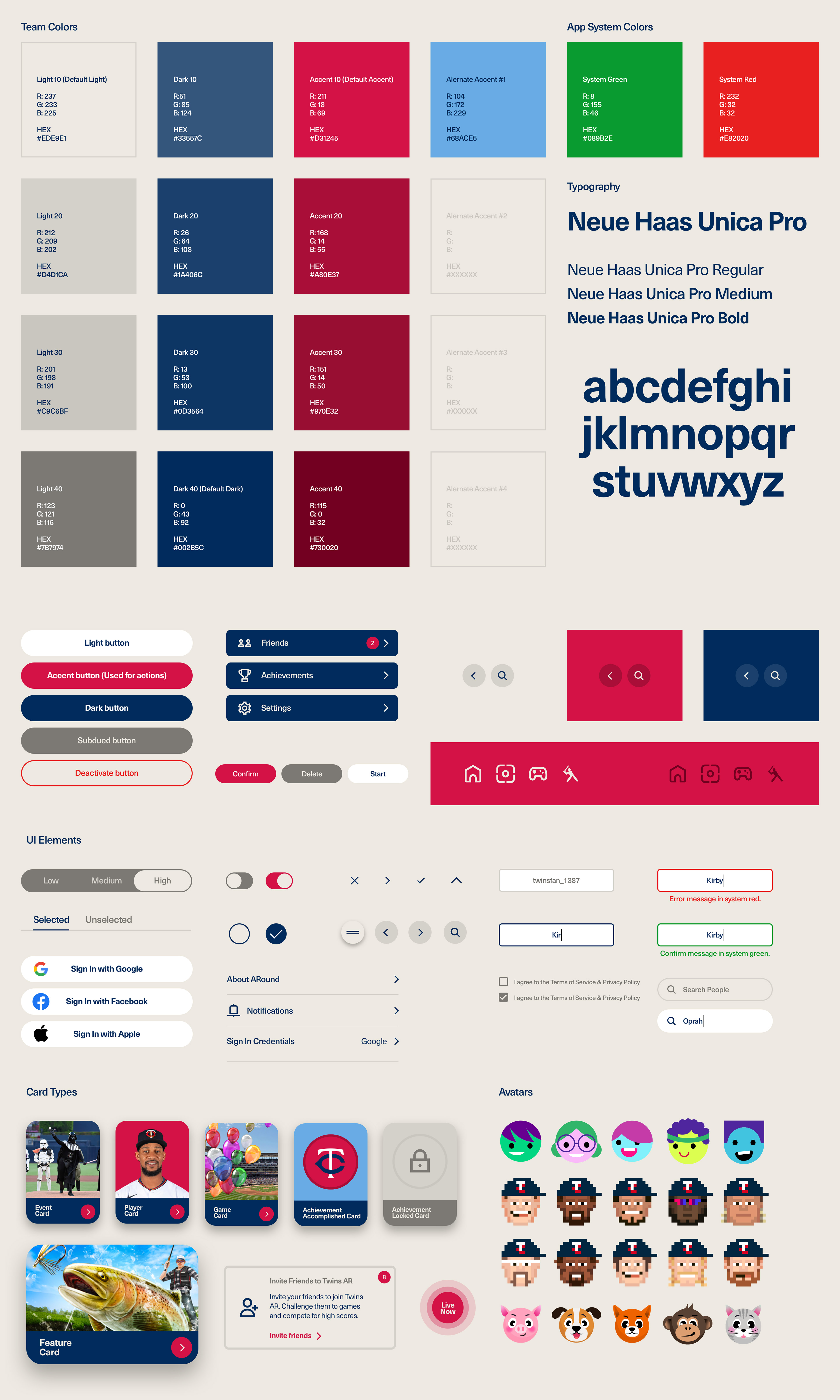 The design system was created to be adaptable to future MLB teams. The color palette is codified to align with other team colors by having a set of colors assigned to Lights, Darks, and Accent colors. Each value when entered then populates the UI system. While the launch of the app for the Twins will be the first ARound integration of AR with the MLB, the goal is to expand the app to other teams and new capabilities over the season.
