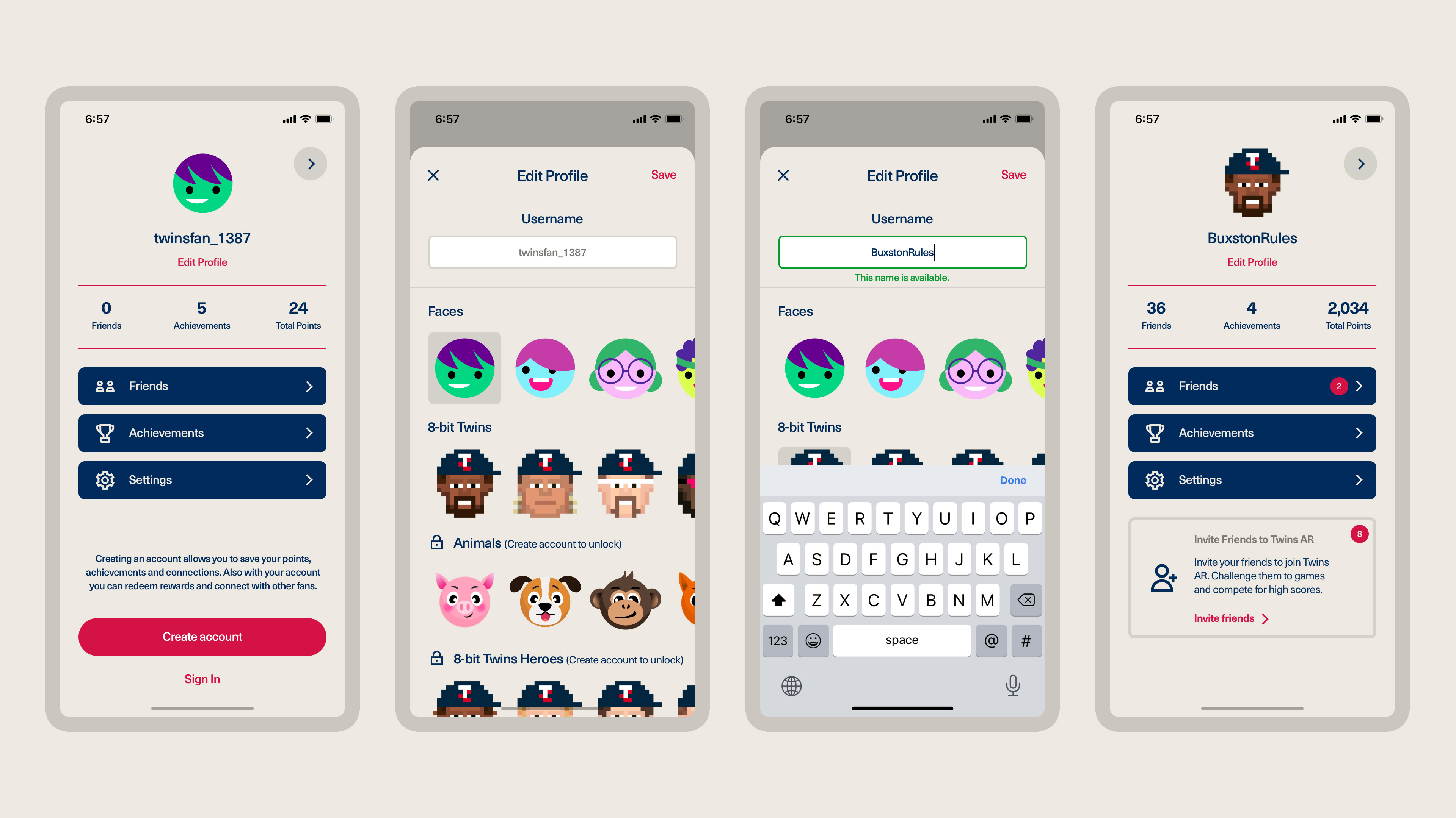 When you first open the app you are assigned a username and avatar. The default avatars are cartoon-ish faces in bright colors. You can select any of the faces or select one of the 8-bit Twins player faces. If you create an account, you have access to more avatars like animal faces or unlocking former Twin heroes.